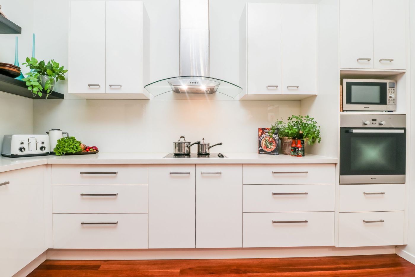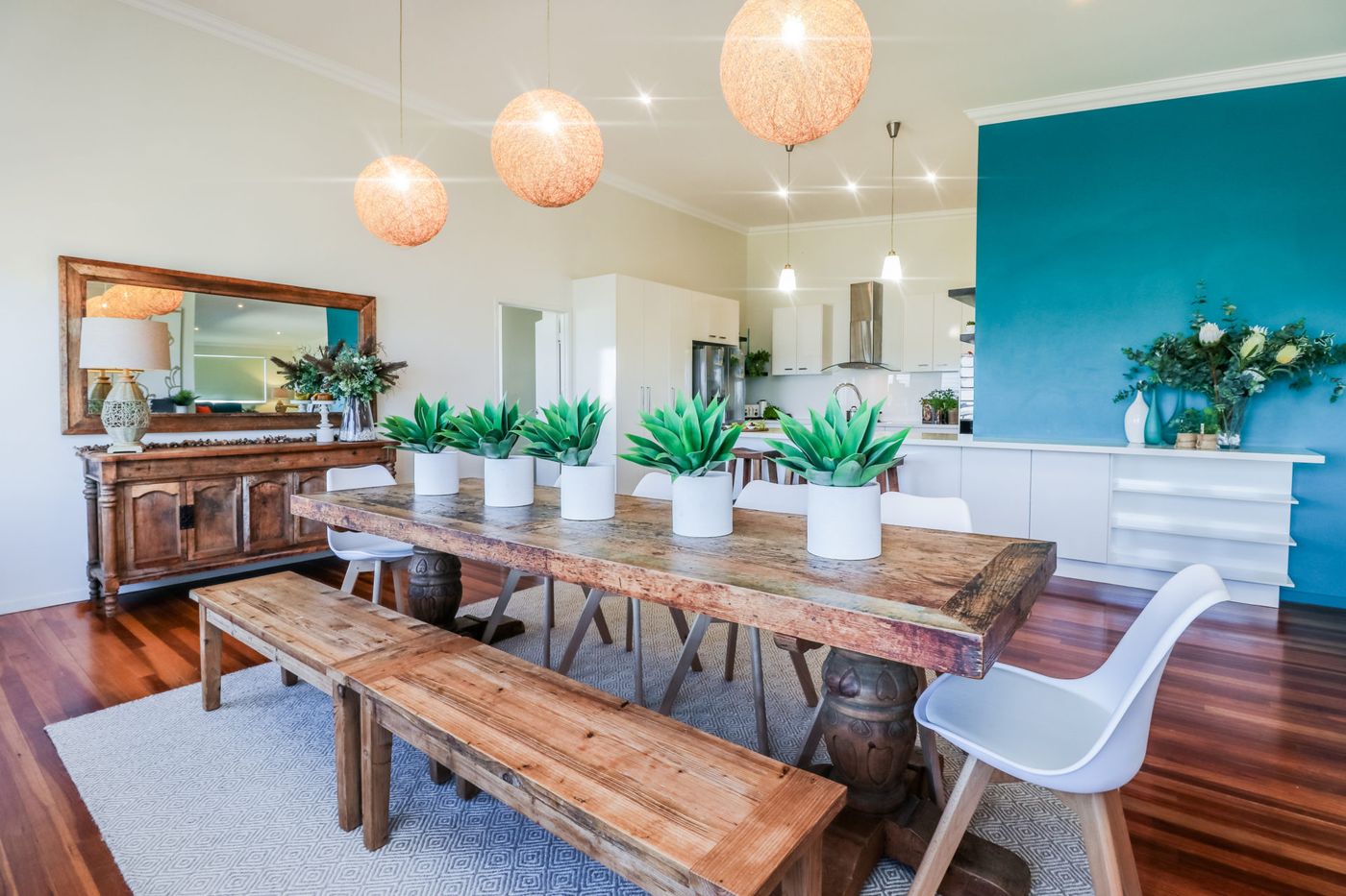 Open-plan living, dining, and modern kitchen with dishwasher and ground coffee machine (BYO coffee)