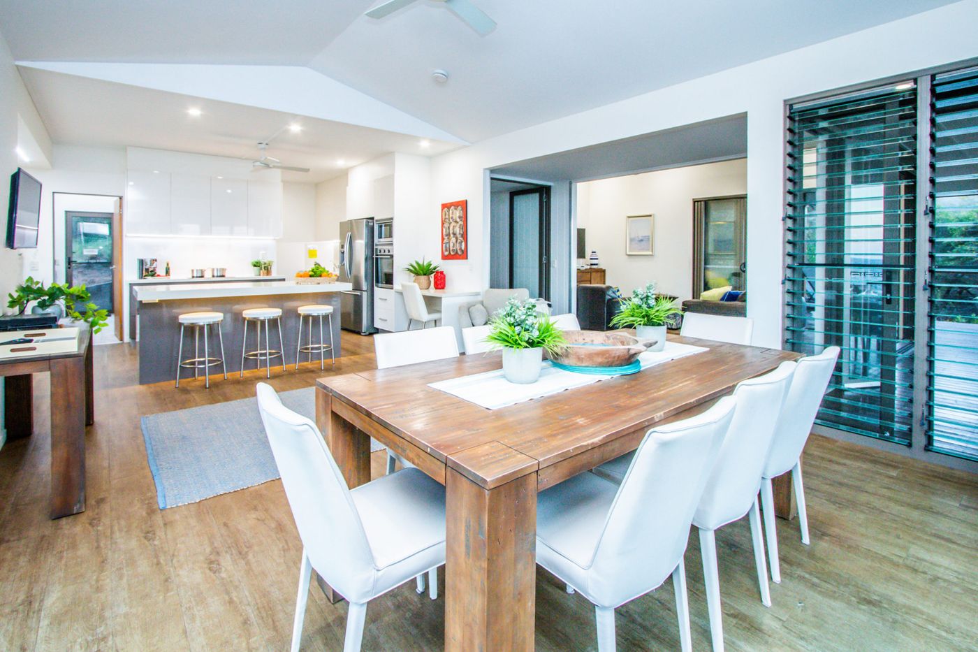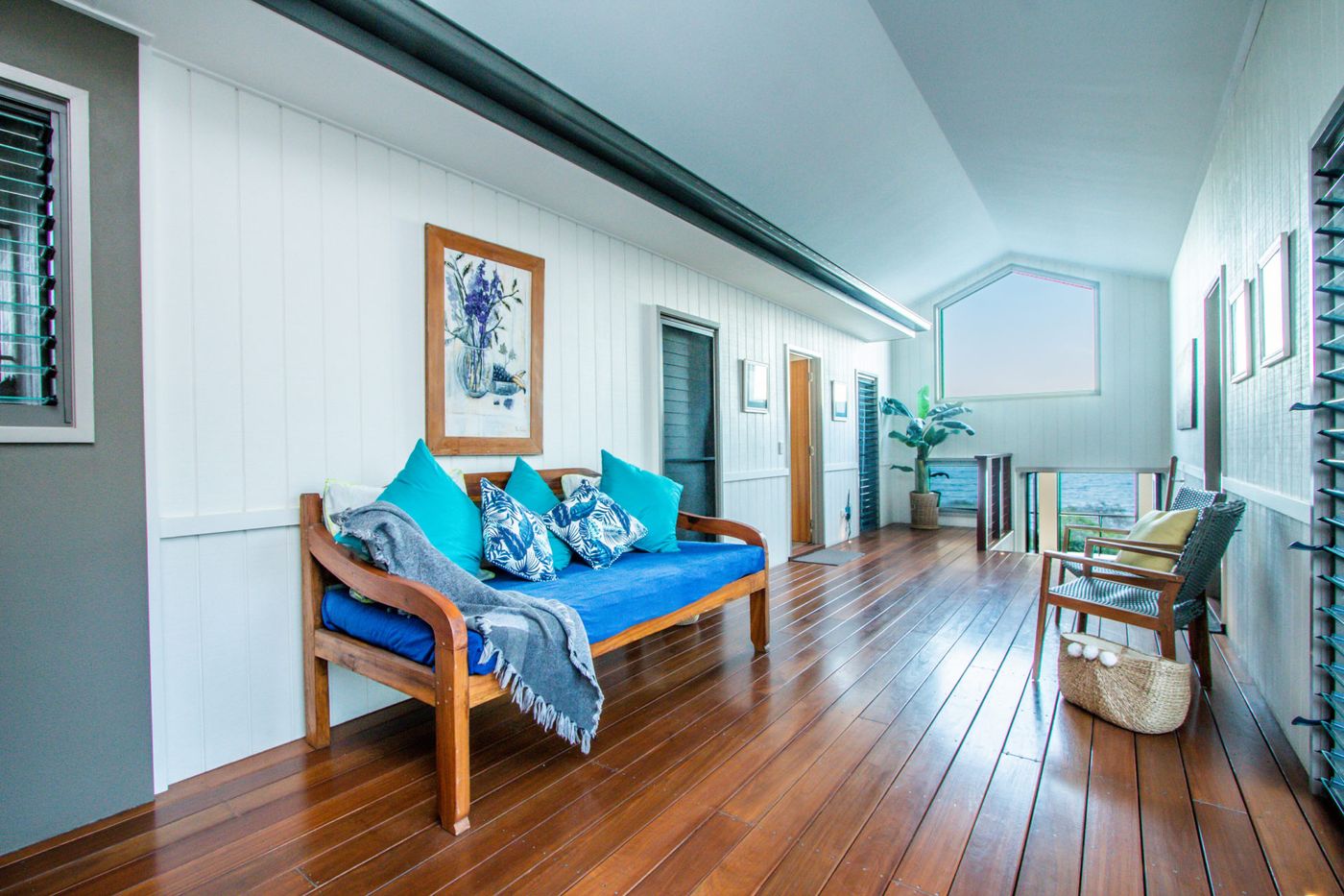Dunes holiday home is spacious in design, spanning over three tiered levels built into the natural landscape to best capture panoramic ocean views from bedrooms & living areas. The design of this home engages environmental benefits, captures cooling sea breezes via the central breezeway that connects the bedrooms to the main living areas.