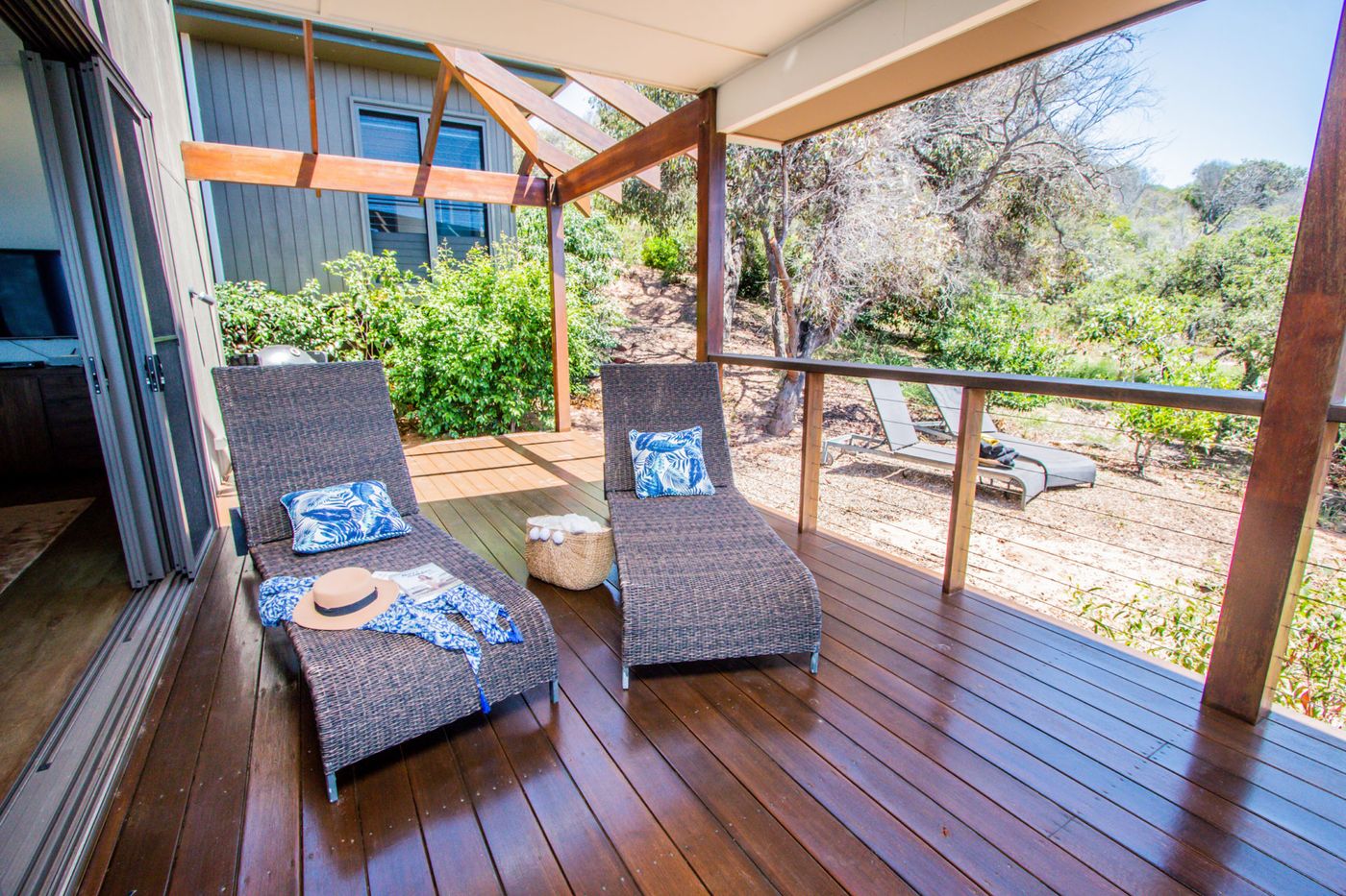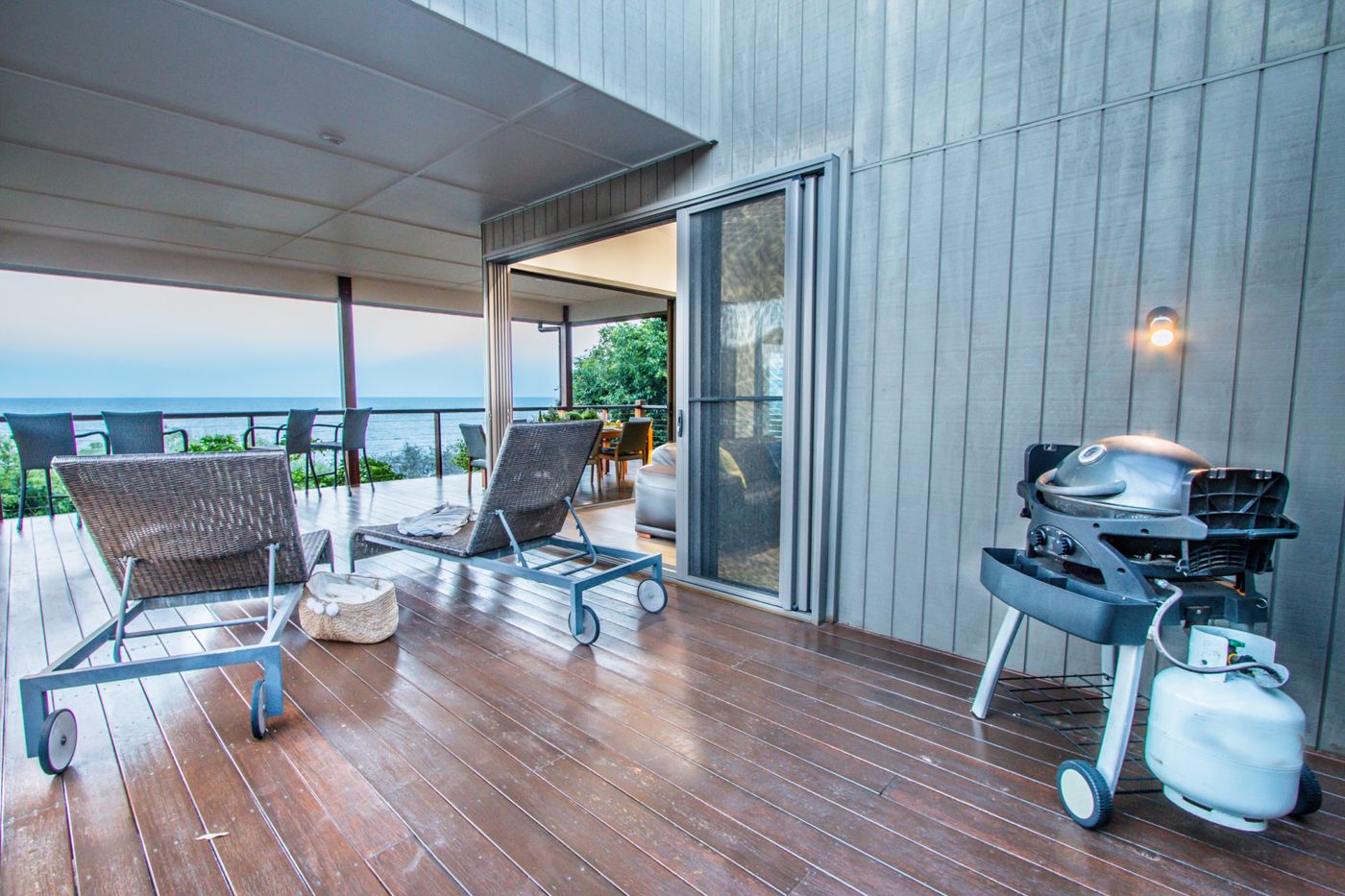 Generous rear deck overlooking the rugged coastline, remote red Rock beach & gorgeous expanse ocean - providing gas weber BBQ, sun lounges & alfresco dining setting.