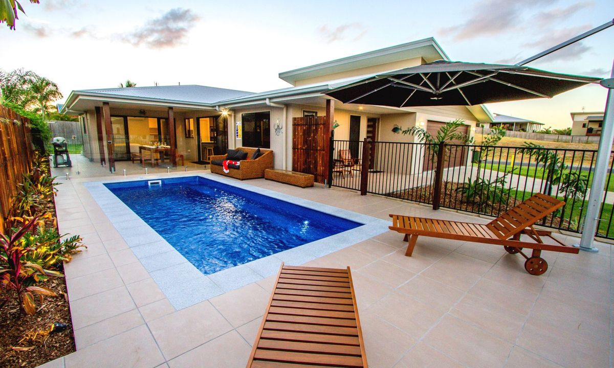 Stunning resort style pool with shade umbrella, sun lounges and out door dining setting