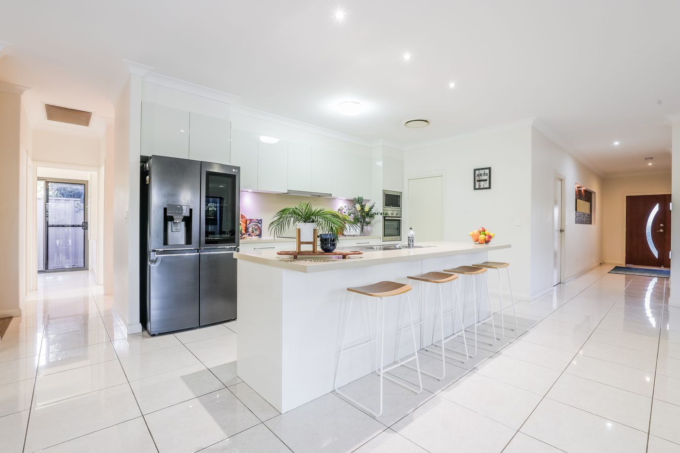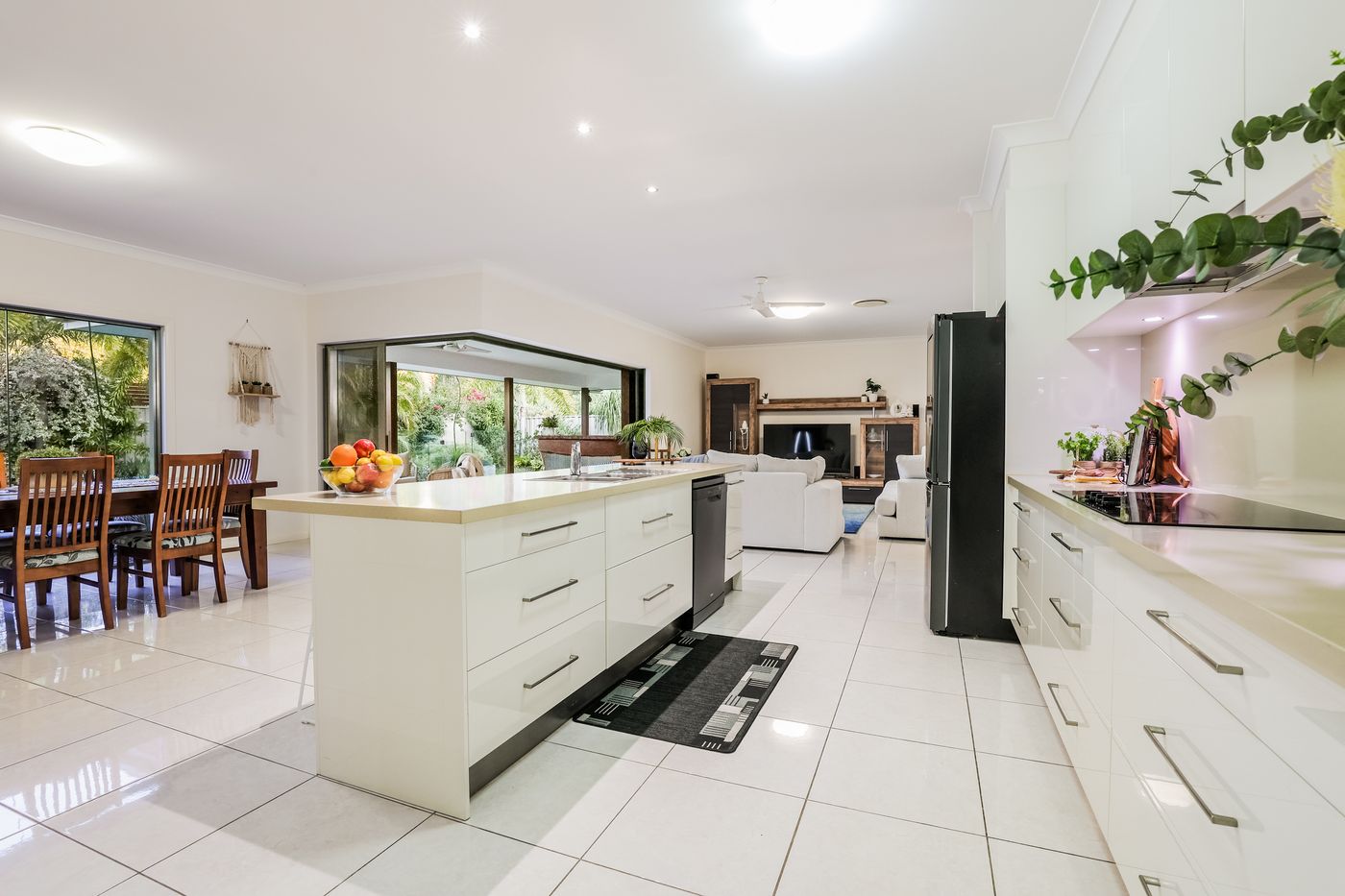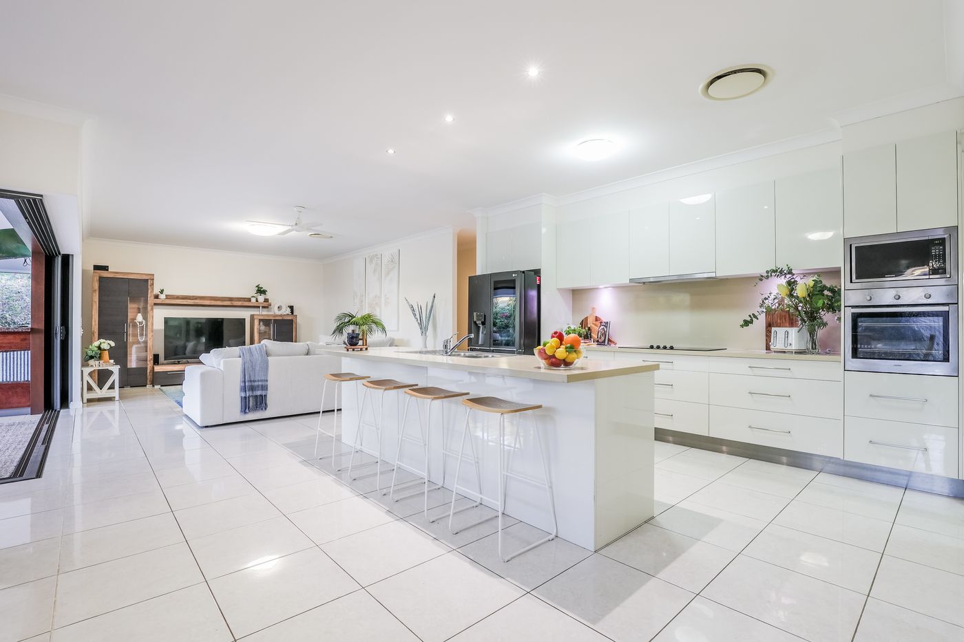 • Fully self-contained kitchen including family sized ice maker fridge, built in oven and stove and island bench with stools