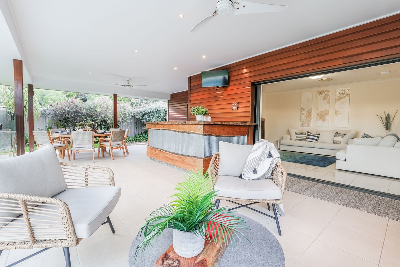 • Luxurious pool - outdoor entertaining patio with dining setting, bar with fridge, outdoor fans