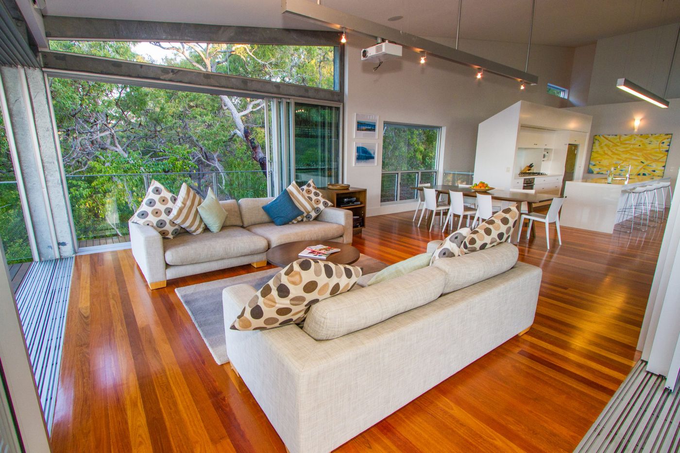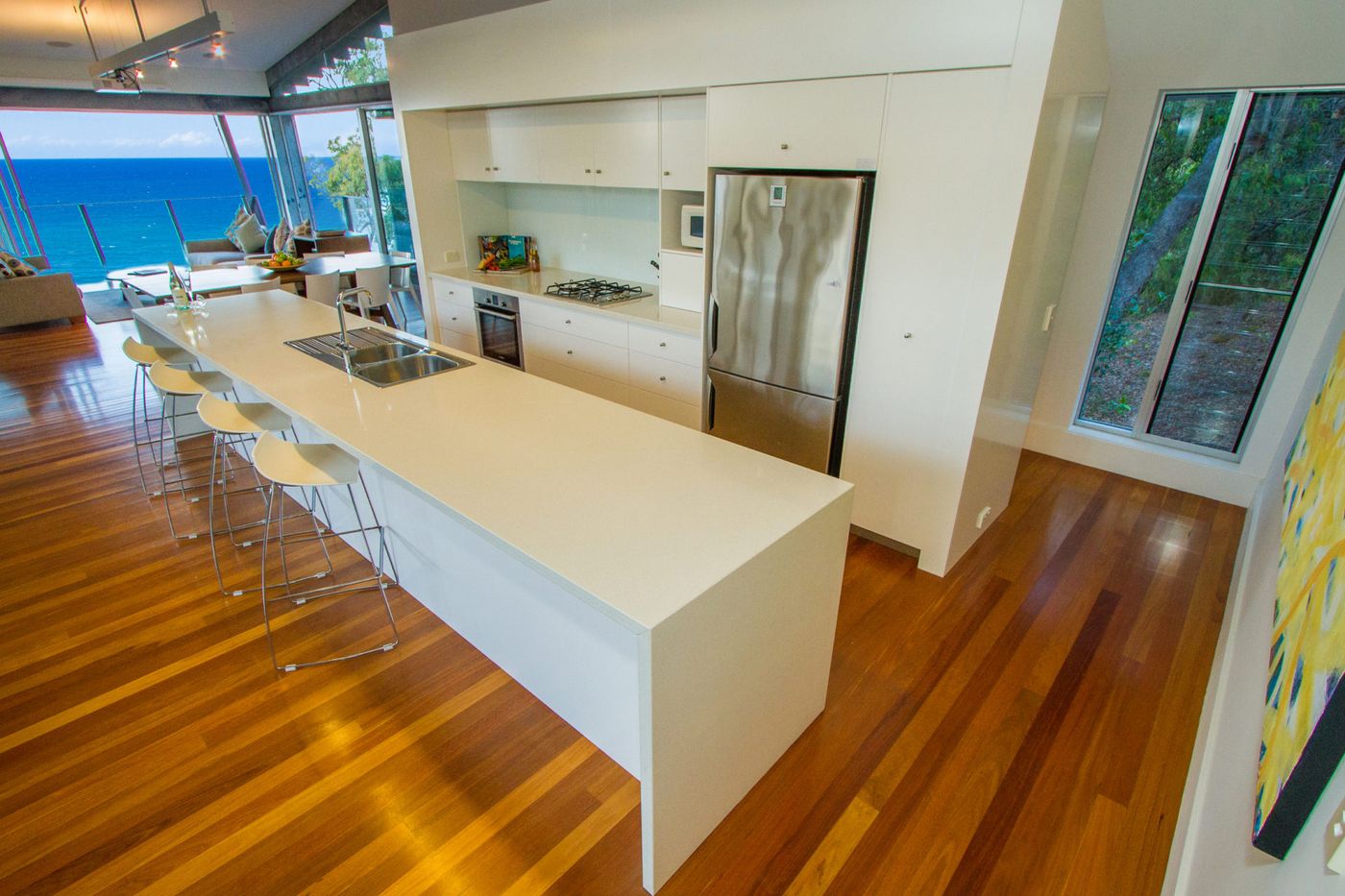 Sliding back the large glass stacker doors, the massive decking and gorgeous timber-floored indoor spaces are brought together to provide seamless indoor/outdoor living. You are now among the treetops, taking in the spectacular Coral Sea views as the gentle breezes sweep by. Built over three levels, there are four bedrooms, each with its own ensuite bathroom (including master suite featuring super-size spa overlooking the water). Two large living areas, crisp white kitchen, dining area, study, powder room and laundry complete the picture.