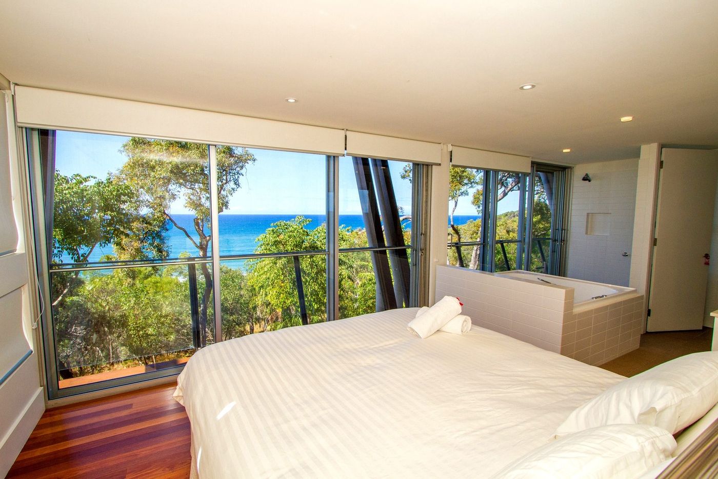 Master Suite on its own level with ocean views - 1 King bed, floor to ceiling commercial-grade stacker opening glass doors, air conditioning, ensuite bathroom with super-size spa and separate study.
