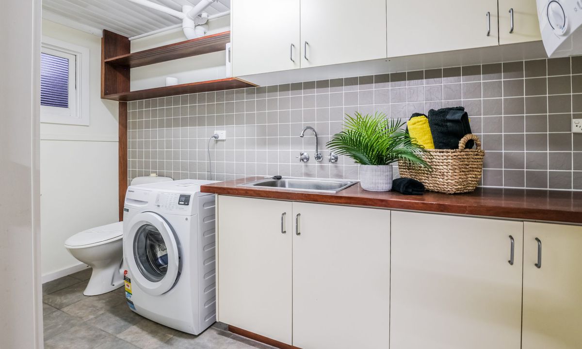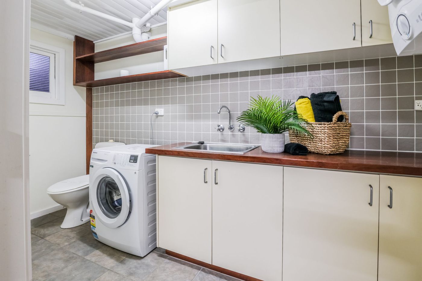 Full laundry with washer & dryer, 3rd toilet plus storage area located under the house.