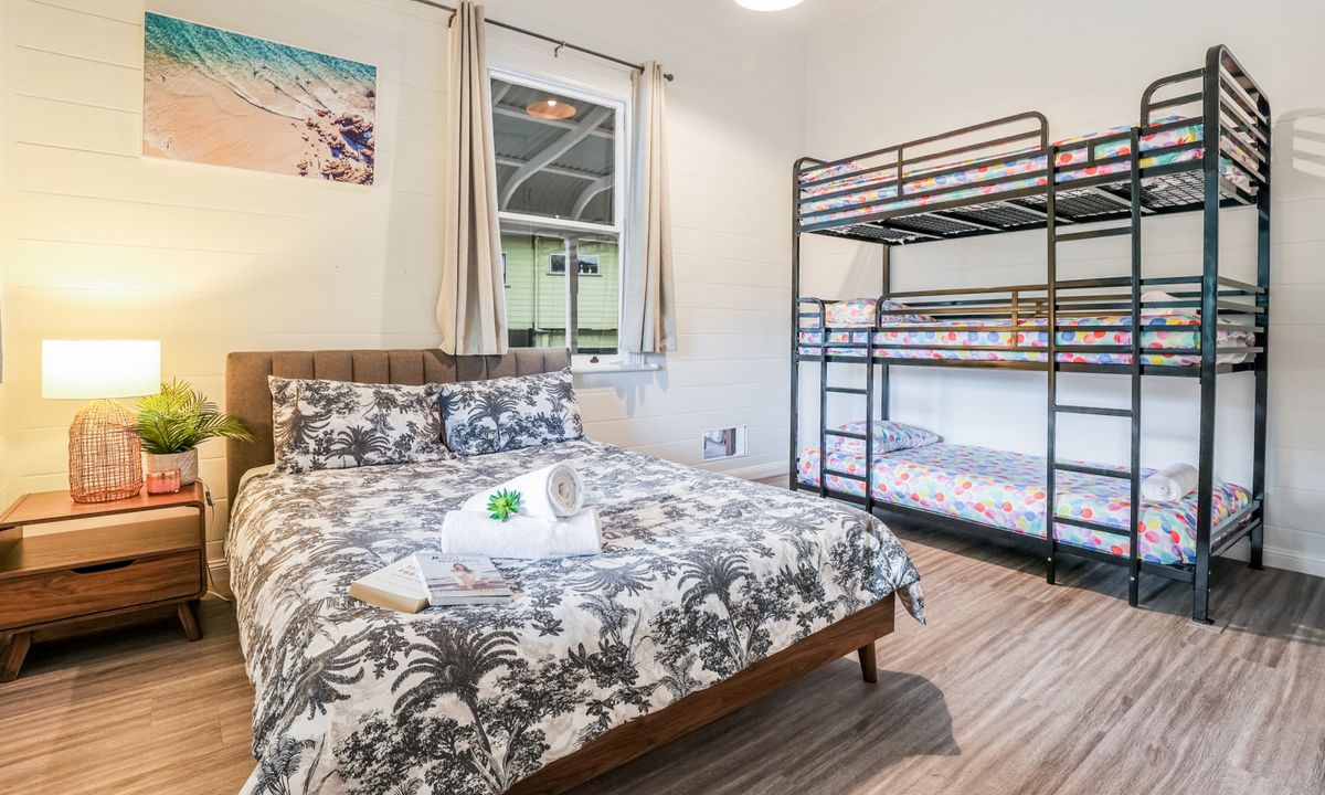 2nd bedroom with Queen bed & a triple bunk (3 singles), linen